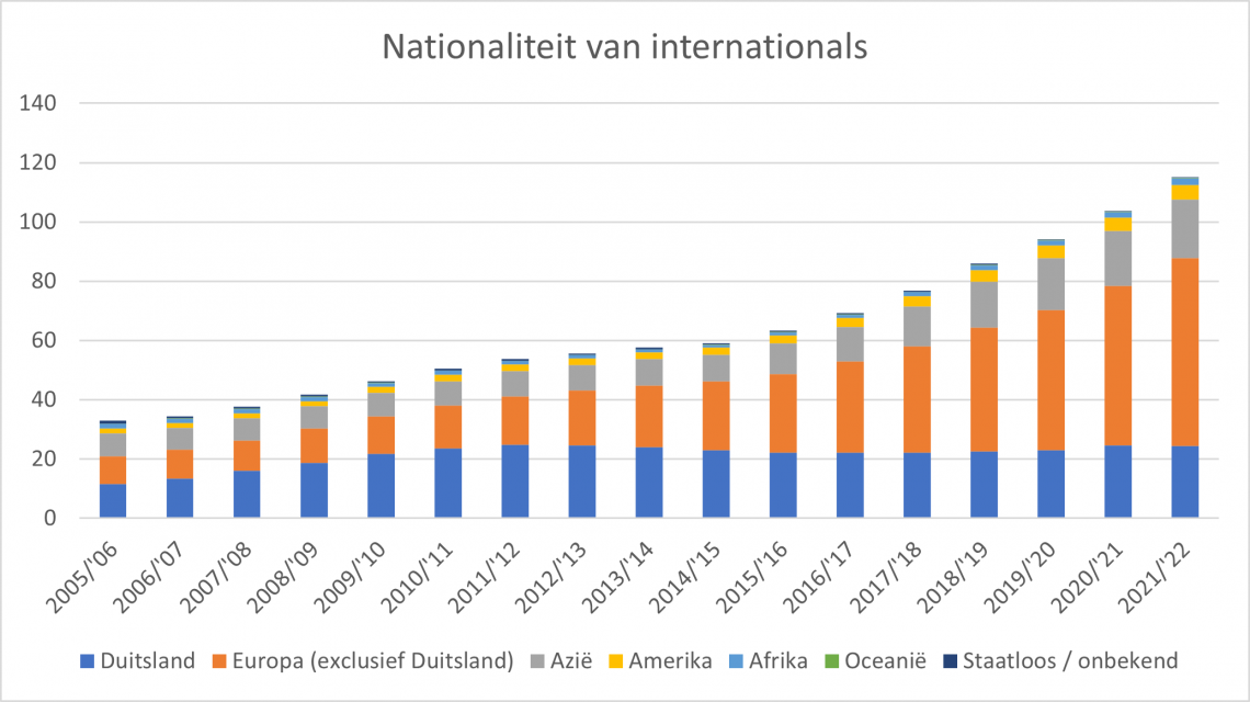 Dit collegejaar studeren er 80,4 duizend internationale studenten aan de universiteiten ten opzichte van 34,8 duizend op de hogescholen. Vooral Europese studenten weten het Nederlandse onderwijs goed te vinden: in 2005/2006 kwam 63 procent van de internationals uit Europa en dit collegejaar is dat maar liefst 76 procent. De instroom van Duitse studenten is de afgelopen jaren ongeveer gelijk gebleven. Er kwamen vooral meer studenten uit andere Europese landen naar Nederland.