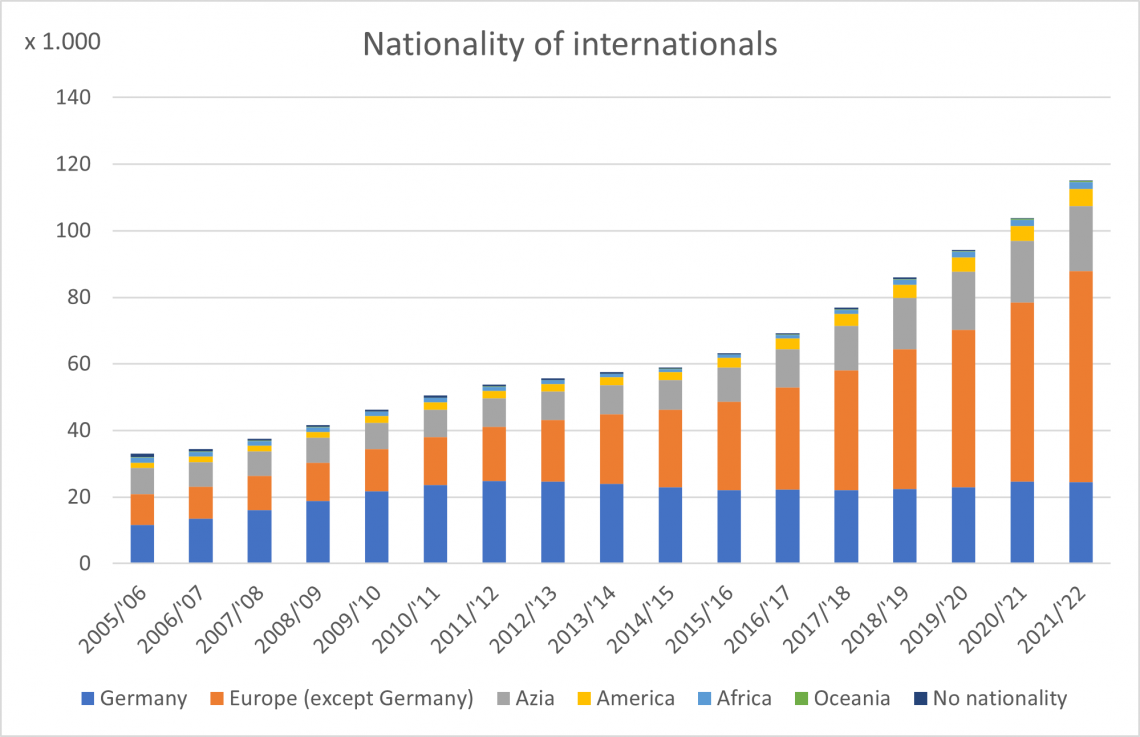 This academic year, 80,400 international students are studying at Dutch universities and 34,800 at universities of applied sciences. European students in particular are making use of Dutch education: in 2005/2006 63 percent of the internationals came from Europe as opposed to 76 percent in the current academic year. The number of students from Germany has remained stable in recent years. An increasing number of students have been coming to the Netherlands from other European countries.