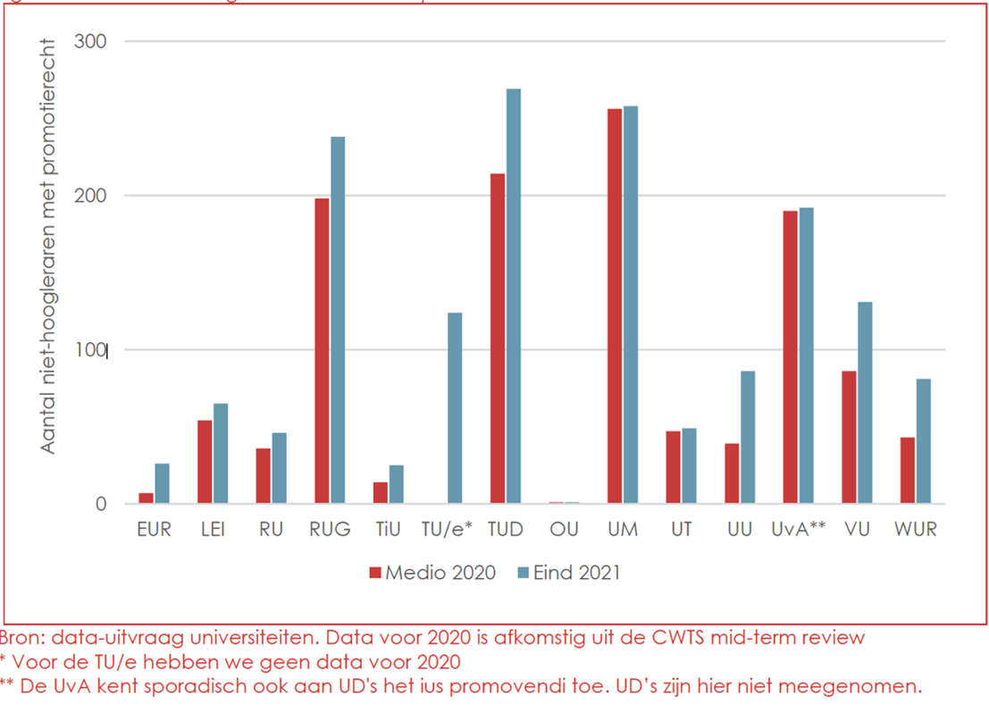 TU Delft en Universiteit Maastricht behoren tot de universiteiten met de meeste niet-hoogleraren met het zogeheten ius promovendi, terwijl Tilburg University, de Erasmus Universiteit en de Open Universiteit relatief weinig niet-hoogleraren het promotierecht toekennen.
