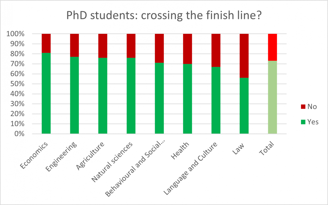 Roughly 40 percent of PhD students in law ultimately fail to complete their dissertations. Although the number of drop-outs varies from year to the next, the average percentage for law is twice as big as those for economics, agriculture, engineering and the natural sciences. In those fields, only 20 percent quit without a PhD.