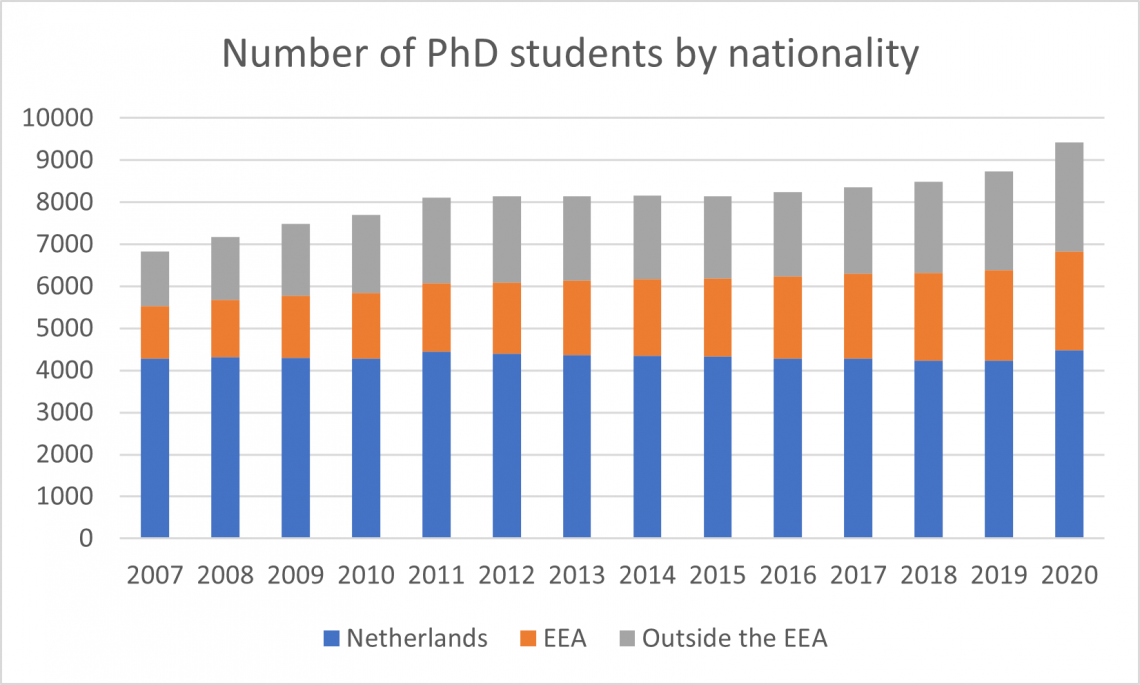 The number of Dutch PhD students employed by universities has remained relatively stable over the years, while the number of international PhD students has been growing steadily. Most of these international doctoral candidates are from countries outside Europe.
