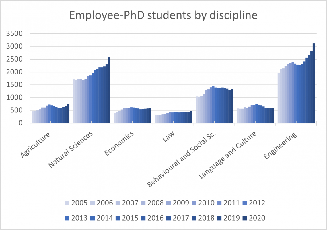 PhD student numbers rose particularly in engineering and natural sciences (by 58 percent). ‘Language and Culture’, on the other hand, only grew by 2 percent.