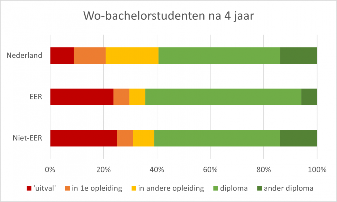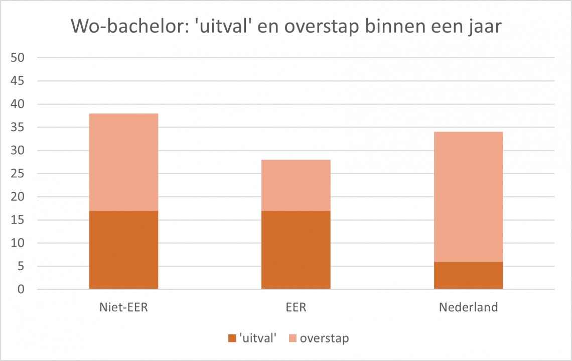 Binnen een jaar blijkt 17 procent van de internationale studenten weer vertrokken. Daarin is geen verschil tussen studenten van binnen en buiten de Europese Economische Ruimte (EER). Misschien kiezen ze een opleiding in een ander land, maar daar zijn geen cijfers over. De inspectie noemt het ‘uitval’.