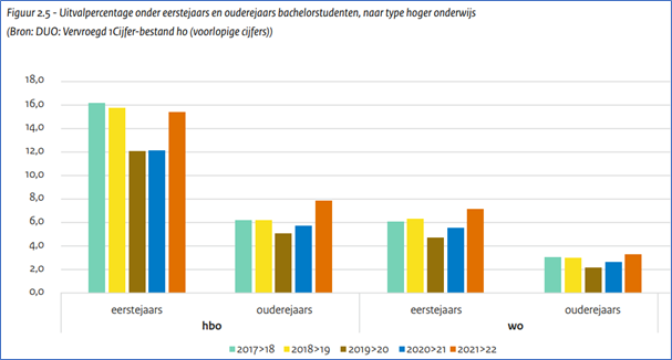 Ook de uitval onder ouderejaars is toegenomen, met name in het hbo: van zes naar acht procent. In het wetenschappelijk onderwijs is de weerslag in latere jaren minder sterk. De uitval van ouderejaars is daar voorlopig zo’n drie procent, ongeveer het peil van vóór de coronacrisis.
