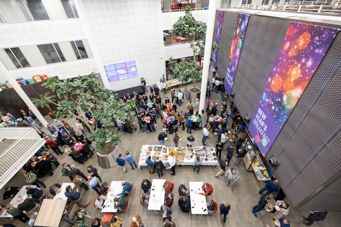 Al voor klokslag acht uur liep de Ravelijn vol en stapelden de duivelse dilemma’s zich op voor de honderden bezoekers aan het nieuwjaarsontbijt: vlees of vega, een appeltje of een eitje? En wat te doen met de collega’s? Het was immers het eerste nieuwjaarsontbijt sinds jaren zonder enige noemenswaardige coronamaatregelen. Zo waagde de een zich aan de traditionele doch altijd ongemakkelijke drie zoenen, de ander verkoos de vriendelijke handdruk en het ietwat afstandelijke coronaknikje of -zwaaitje was nog alom aanwezig.