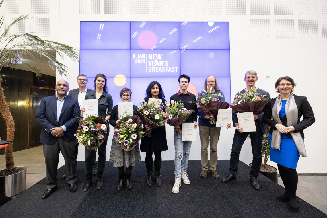 Traditioneel voor het nieuwjaarsontbijt is ook de uitreiking van de UT in de media-prijzen: een certificaat, cadeaubon en een boeketje. Studententeam Electric Superbike Twente won in de studentencategorie en de ‘PhD Media Award’ ging naar promovendus Rianne Bulthuis, voor onderzoek naar borstkankeronderzoek met behulp van fotoakoestiek. De ‘Social Media Award’ was voor Pieter-Tjerk de Boer, die massaal media-aandacht oogstte doordat het door hem ontwikkelde ‘WebSDR’ gebruikt werd om Russische militairen af te luisteren.