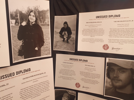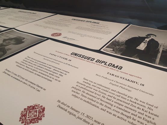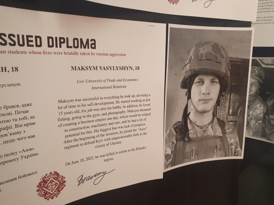 The idea to tell the 36 stories arose recently at the University of Toronto. A group of exchange students from Ukraine wanted to commemorate exactly one year of war there on 24 February. More than 45 universities worldwide joined the idea, including UT. 'A student friend from Toronto approached me, whether I wanted to set up the exhibition at my university. I didn't have to think long about it. I thought the idea was incredibly strong. Besides, they had already put a lot of work into approaching families for verification and asked the universities to arrange the students' diplomas,' says Konashchuk.