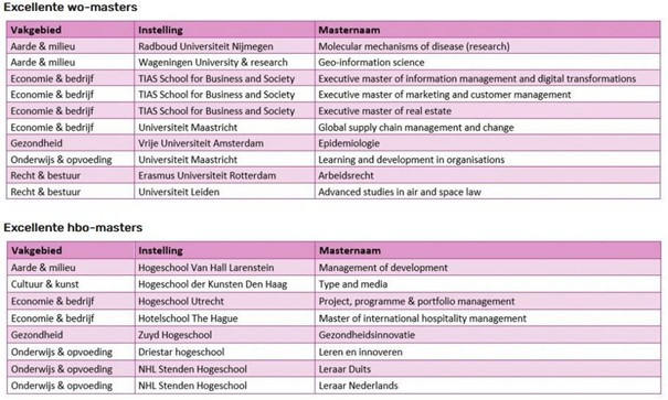 Afgaand op het lijstje met excellente masters doet de particuliere TIAS School for Business and Society goed mee in het wo. In het hbo scoren de lerarenopleidingen Duits en Nederlands van NHL Stenden maximaal.