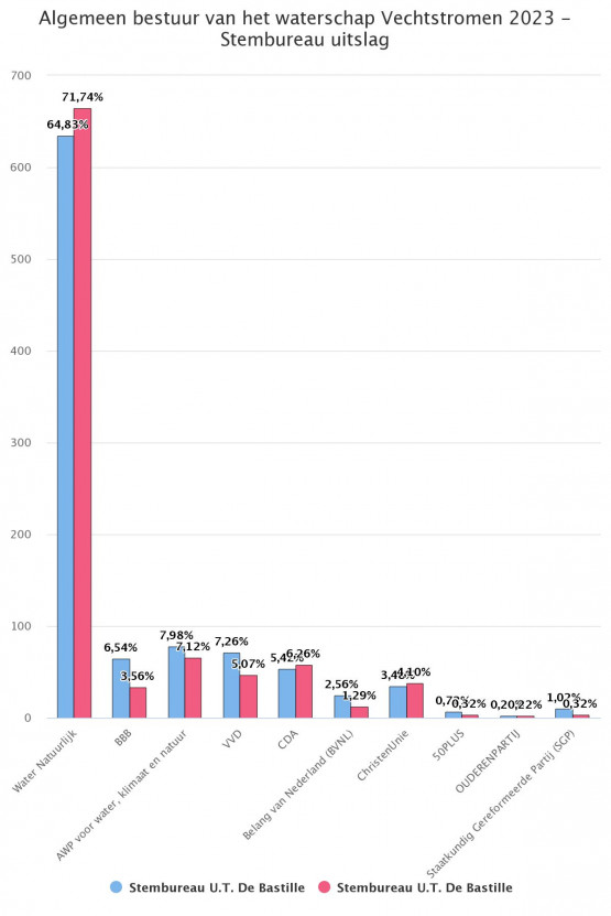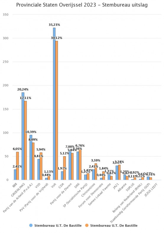Volt kreeg in de twee stemlokalen van de Bastille in totaal 616 stemmen. De partij torent daarmee uit boven de rest. Op ruime afstand volgen GroenLinks (352 stemmen), PvdA (174 stemmen), D66 (126 stemmen) en Partij voor de Dieren (121 stemmen). Landelijke winnaar BBB haalde op de campus ‘slechts’ 81 stemmen.