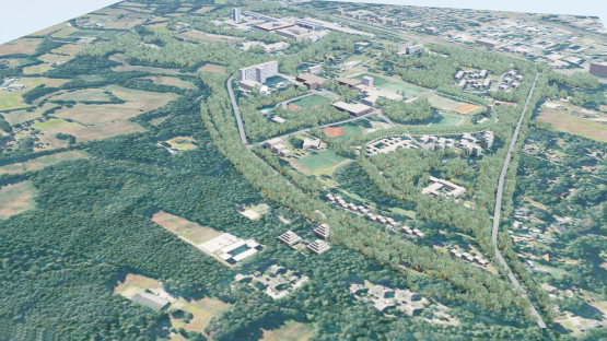 De student loopt al jaren op de campus rond, maar dacht er nooit eerder aan om daar een simulatie van te maken. ‘Tot ik drie weken geleden met een collega een burgerlijke wandeling maakte in de pauze en hij dat idee opperde. Ik ging er gelijk mee aan de slag.’ Hofman legt het werk in grote lijnen uit. ‘Het voordeel van de campus is dat het grootste gedeelte heel gedetailleerd in Google Maps staat. Die data importeerde ik in een 3D-programma, net als de huisstijl van de UT. Die zie je terug in de auto waarmee je kan racen. In de herkenbare punten heb ik het meeste werk gestopt.’