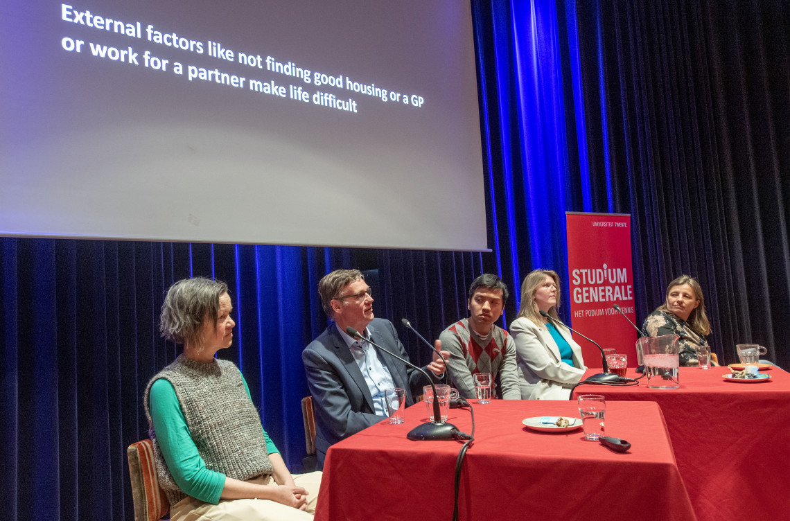 Bij de behandeling van de derde stelling – ‘External factors like not finding good housing, a GP or work for a partner make life difficult’ – nam de discussie een onverwachte wending. Meerdere aanwezigen deelden negatieve ervaringen met de huisartsenpraktijk op de campus. Ter illustratie wees iemand op de Google-reviews (een beoordeling van 2,6 uit 5) van de praktijk. Het publiek vroeg de rector of de UT niet kon stoppen met de praktijk.