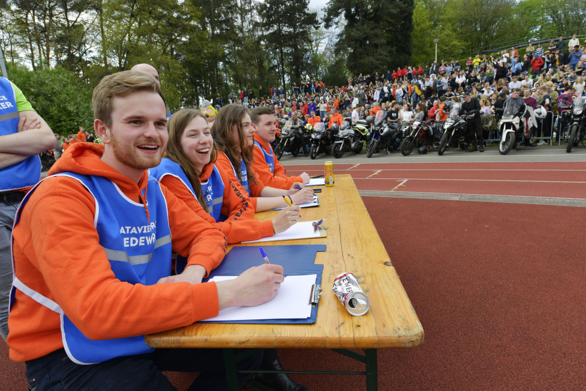Als de eerste motoren de atletiekbaan van de campus opdraaien, zit de stemming er bij de meeste toeschouwers al goed in. Misschien komt het door de halve liters huismerkbier, waaraan vandaag geen gebrek lijkt te zijn op de campus. ‘Een man van cultuur drinkt zijn Klok op kamertemperatuur’, prijkt op een spandoek aan het dranghek. Maar ook het mooie weer draagt bij aan de goede sfeer.