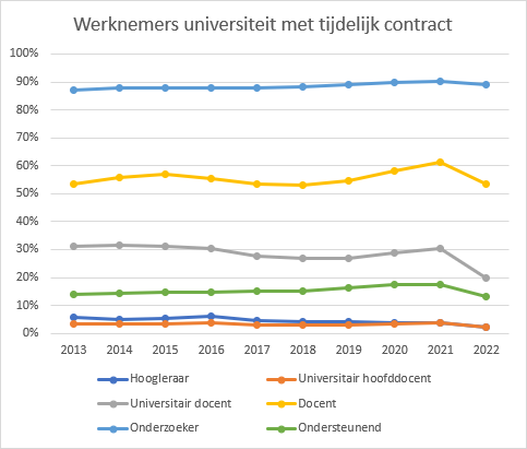 Ook de ‘universitair docenten’ (UD’s) werken nu beduidend minder vaak op een tijdelijk contract (29 in plaats van 19 procent). Ook het ondersteunend personeel heeft nu iets vaker een vaste baan.