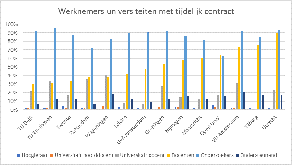 Maar de verschillen tussen de universiteiten zijn nog altijd enorm. In Delft heeft 30 procent van de ‘docenten’ een tijdelijk contract, tegen 89 procent aan de Universiteit Utrecht. In Wageningen heeft 40 procent van de universitair docenten een tijdelijk contract, in Tilburg is dat volgens de nieuwste tabellen nul procent.