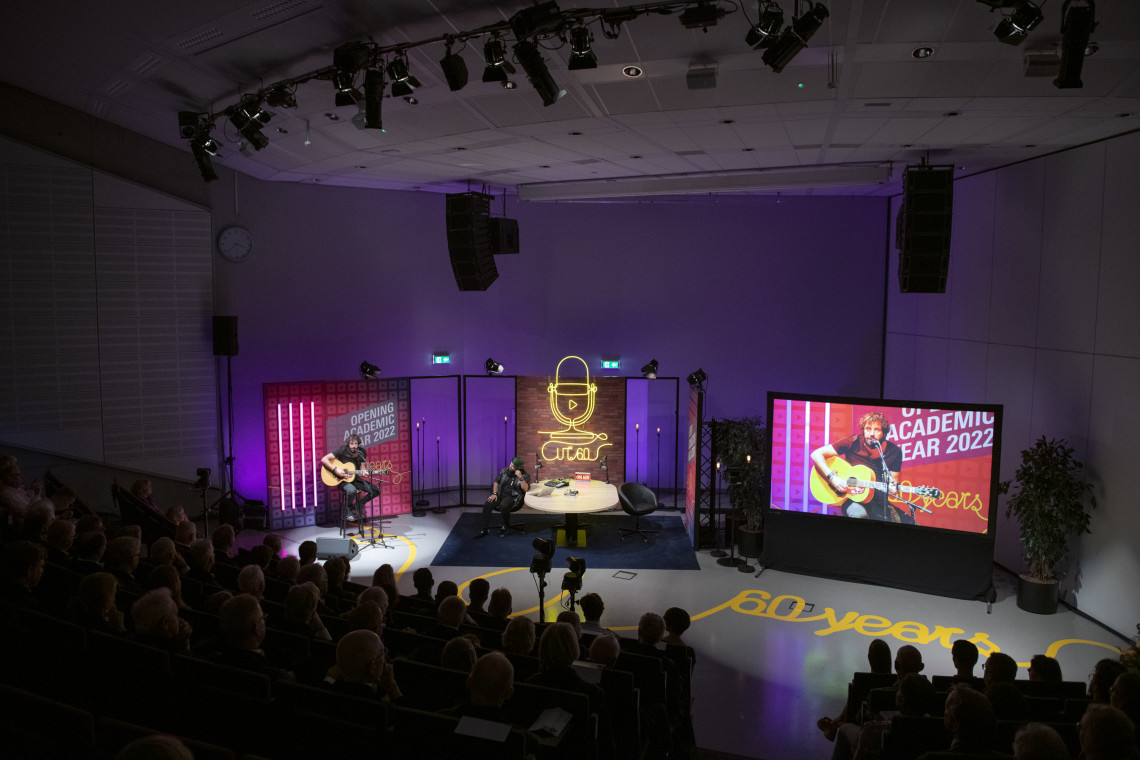Aan Dijkgraafs keynote ging een welkomswoord van collegevoorzitter Vinod Subramaniam vooraf, die in grote lijnen overeenkwam met de woorden van de minister. Subramaniam opende zijn verhaal met het aanstippen van de bijzondere locatie: het Wilminktheater in Enschede. ‘Precies tien jaar geleden hielden we de opening voor het laatst in het centrum van Enschede. In die tien jaar groeide de UT flink, met zo’n dertig procent meer studenten en dertig procent meer medewerkers. Het is een belangrijke ontwikkeling die aansluit bij onze overtuiging dat we een betekenisvolle maatschappelijke impact moeten hebben, door ons deel van het technisch geschoolde talent op te leiden dat nodig is om de grote transformaties waar we voor staan aan te pakken.’