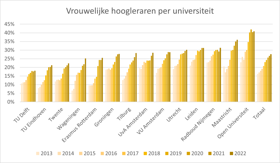 De situatie verschilt per universiteit. In Wageningen neemt het aandeel vrouwelijke hoogleraren met meer dan drie procent toe. Nijmegen en Tilburg komen boven de twee procent groei uit. Maar bij de Vrije Universiteit Amsterdam is het aandeel vrouwelijke hoogleraren achter de komma juist afgenomen. Op de UT neemt het aandeel mondjesmaat toe, maar het aantal vrouwelijke hoogleraren zit nog onder de 25 procent. Die 25 procent is het streefcijfer voor 2025.