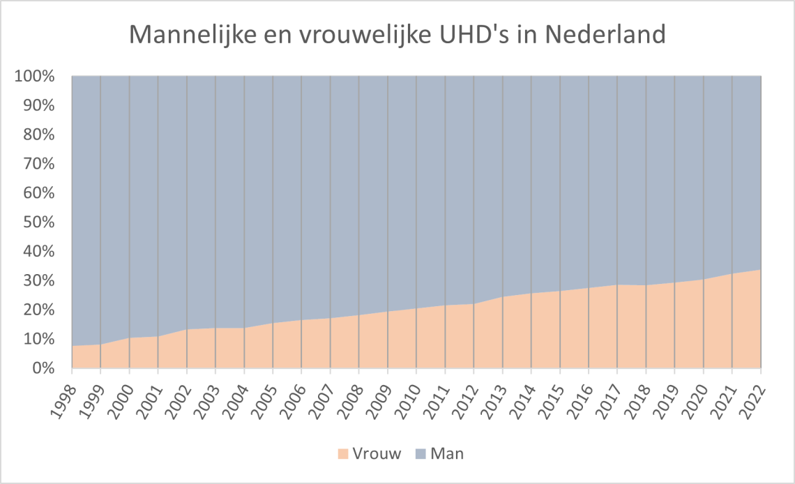 Een trede lager op de carrièreladder zijn er meer vrouwen, al is het verschil met de hoogleraren niet heel groot. Eén op de drie universitair hoofddocenten is vrouw. Afgelopen jaar kwam er 1,4 procentpunt bij.
