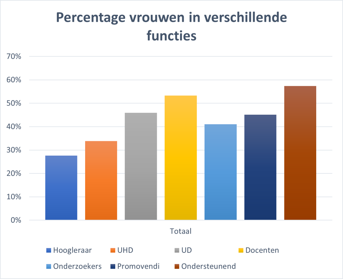 Van de docenten zonder onderzoekstaak is de meerderheid vrouw. Hetzelfde geldt voor het ondersteunend personeel, van de portier tot de beleidsmedewerker.