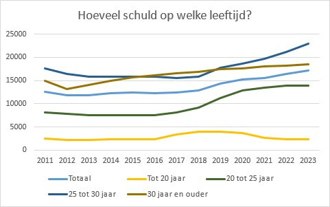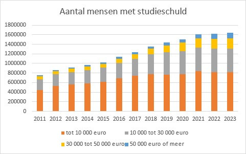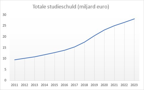 Begin 2023 hadden ruim 1,6 miljoen mensen een studieschuld. Sinds de invoering van het leenstelsel in 2015 is de gemiddelde schuld met 4.700 euro toegenomen tot 17,1 duizend euro.