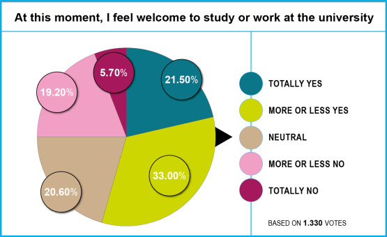 De meeste respondenten voelen zich meer welkom binnen de universiteit dan daarbuiten: ongeveer de helft van de respondenten geeft de voorkeur aan de academische wereld, terwijl 37 procent geen verschil ervaart. 'De universiteit staat positiever tegenover internationalisering, dus het voelt als een veiligere plek om een immigrant te zijn', reageert een Amerikaanse ondersteunende medewerker aan de UT. Binnen de universiteit is er een gemeenschapsgevoel, en ook al spreken we niet allemaal dezelfde taal, we hebben toch iets gemeen. Buiten de universiteit kan het soms een uitdaging zijn om contact te leggen met autochtone Enschedeërs', vult een Spaanse bachelorstudent aan. En volgens een Duitse promovenda 'lijkt de UT ondanks de nationale druk toch te proberen internationaal te blijven'.