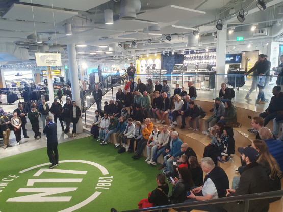 Na een flinke tocht - in Calais was zo’n tweeënhalf uur geduld nodig voordat de ferry vertrok - kwam de bus vrijdag aan het einde van de middag aan in London Stratford. De wijk, in het oosten van Londen, diende in 2012 als epicentrum voor de Olympische Spelen. Het officiële programma startte zaterdagochtend, toen het UT-gezelschap naar het splinternieuwe stadion (kosten ruim 1 miljard Britse pond) van Tottenham Hotspur werd gebracht in Londen-Noord. Daar vielen de aanwezigen van de ene in de andere verbazing. Over het contrast tussen de pracht en praal van de arena en de verpauperde buurt bijvoorbeeld. Wat tijdens de tour vooral indruk maakte, was de grandeur van het nieuwe stadion, met het veld zo glad als een biljartlaken, de enorme tribunes en de luxe catacomben. ‘Dit is toch even wat anders dan ons complex bij Vogido’, merkte een Enschedese UT’er scherp op.