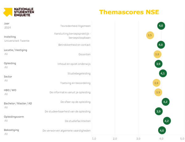 In een dashboard kun je ook instellingen vergelijken. De UT scoort op praktisch alle criteria boven het landelijke gemiddelde en de algemene tevredenheid komt uit op een 4,0 uit 5 (tegenover 3,8 landelijk). De enige uitzondering op die regel is de categorie 'aansluiting beroepspraktijk-beroepsloopbaan'. Landelijk geven studenten dat een 3,6. De UT scoort hierop een 3,5.