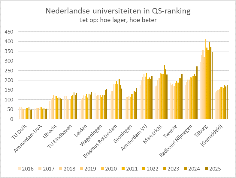 De makers passen de methode weleens aan – vorig jaar kwam bijvoorbeeld het criterium van duurzaamheid erbij – maar de posities van de universiteiten zijn toch redelijk stabiel. Er zijn zelden grote verschuivingen.