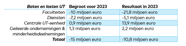 Dat de UT afstevende op een miljoenentekort in 2023 was te verwachten. Een tekort van 15 miljoen was begroot; afgelopen december was de inschatting nog dat het tekort richting 8,7 miljoen euro zou gaan vanwege enkele financiële meevallers. Het daadwerkelijke resultaat komt nu volgens de jaarrekening uit op minus 10,8 miljoen euro.