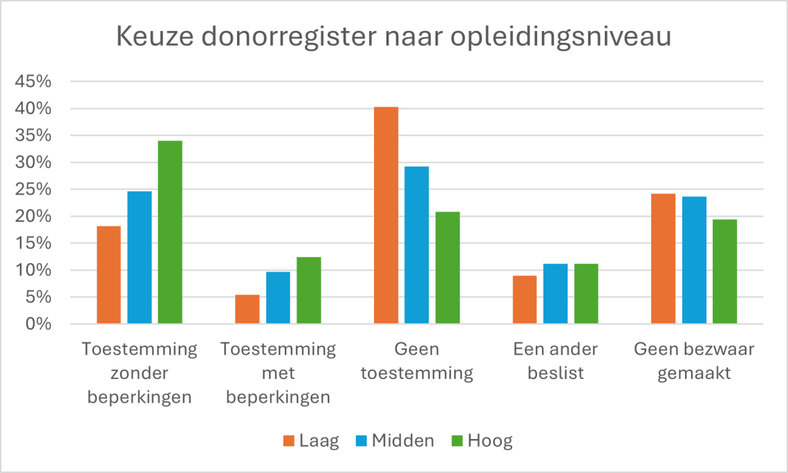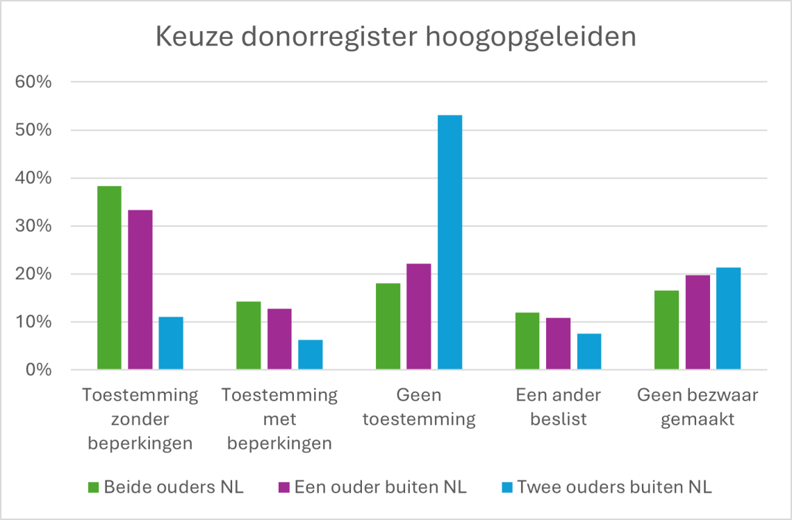 Ook onder de hoogopgeleiden is dit patroon zichtbaar: zijn hun ouders buiten Nederland geboren, dan is de kans kleiner dat ze orgaandonor willen zijn.