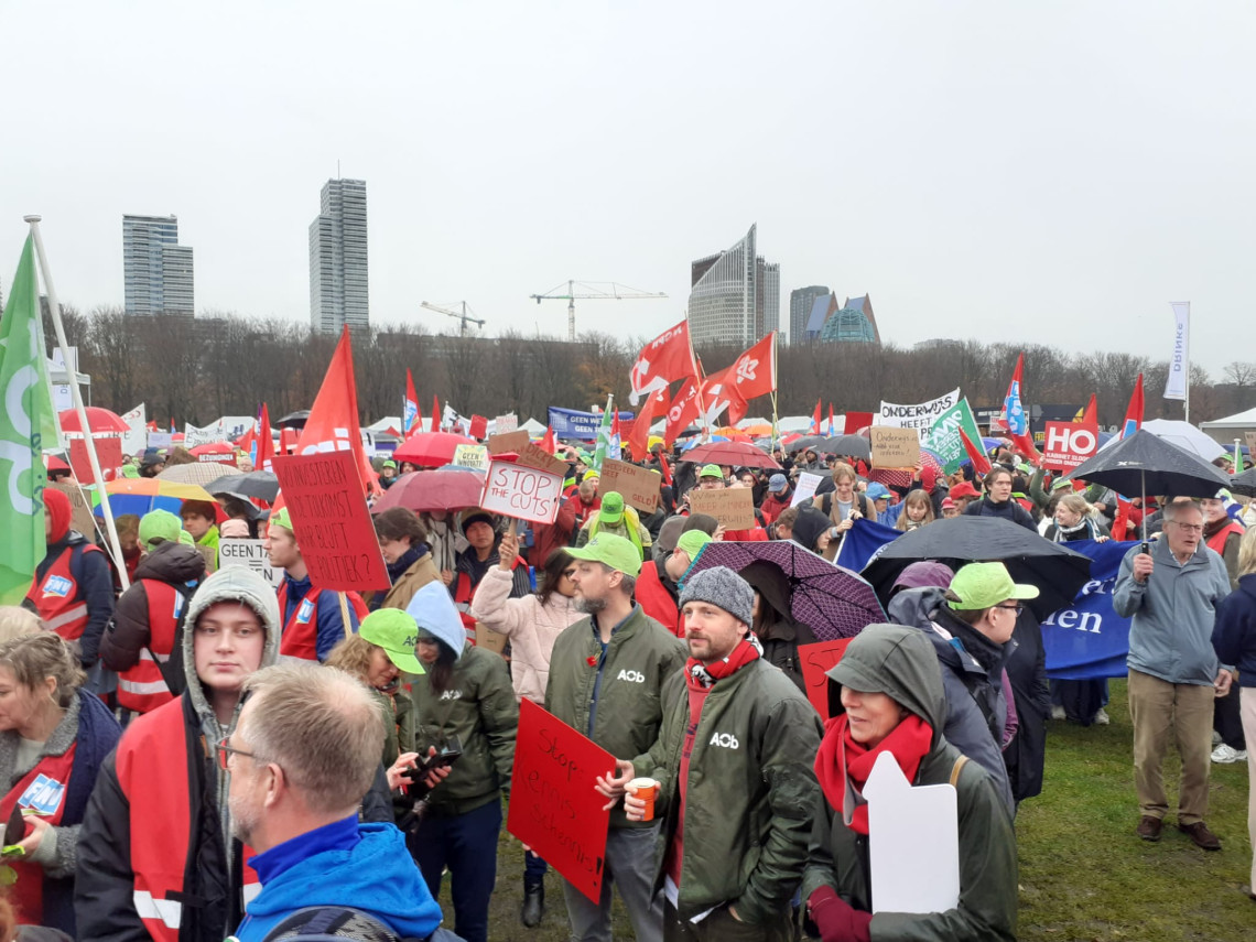 UT-voorzitter Vinod Subramaniam en vicevoorzitter Machteld Roos zijn ook aanwezig op het Malieveld om te protesteren. Onduidelijk is nog hoeveel demonstranten aanwezig zijn op het Malieveld, al wordt het terrein momenteel uitgebreid vanwege de drukte. En dan moeten de mensen die vanwege treinvertragingen wat later zijn nog aansluiten...