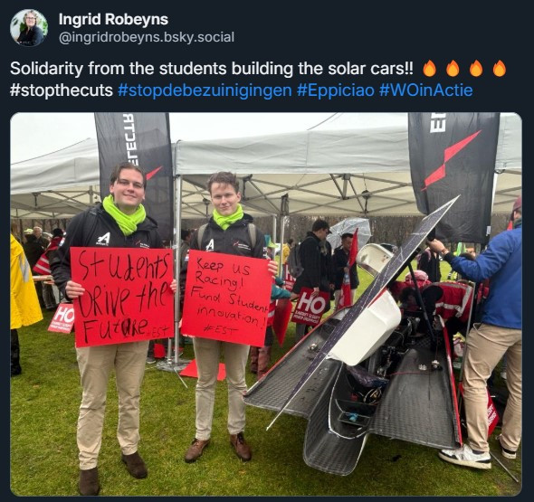 Ingrid Robeyns, hoogleraar aan de Universiteit Utrecht en een van de boegbeelden van WOinActie, ziet dat de Twentse studententeams ook hun weg naar het Malieveld hebben gevonden - en niet alleen zij die de zonneauto's bouwen.
