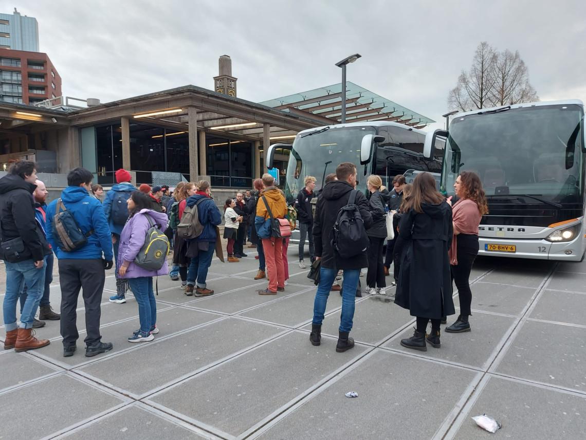 Het busgezelschap is bijna in Den Haag. De voorbereidingen zijn getroffen: de spandoeken en kartonnen bordjes zijn mee, de academische variant op ‘Bella Ciao’ is ingestudeerd en de rode fluitjes zijn uitgedeeld. Om 13 uur begint het protest op het Malieveld officieel.
