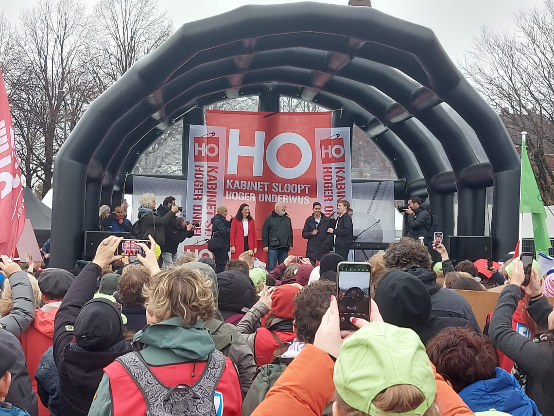 Niet alleen de AOb, maar ook WOinActie vindt dat minister Bruins de eer aan zichzelf moet houden. ‘Eppo, als je ons zo goed begrijpt, neem dan ontslag. Ciao’, klinkt het. Studentenbonden ISO en LSVb betreden vervolgens het podium. Het ISO vreest voor de schade aan toegankelijkheid en kansengelijkheid in het hoger onderwijs. De LSVb zegt dat studenten met de mogelijke invoering van de langstudeerboete als pinautomaat worden gebruikt. ‘Vandaag is de eerste stap. We moeten vechten voor onze toekomst en die is niet gewonnen met één protest. We hebben het leenstelsel van tafel geveegd, dat doen we nu ook met de langstudeerboete.’