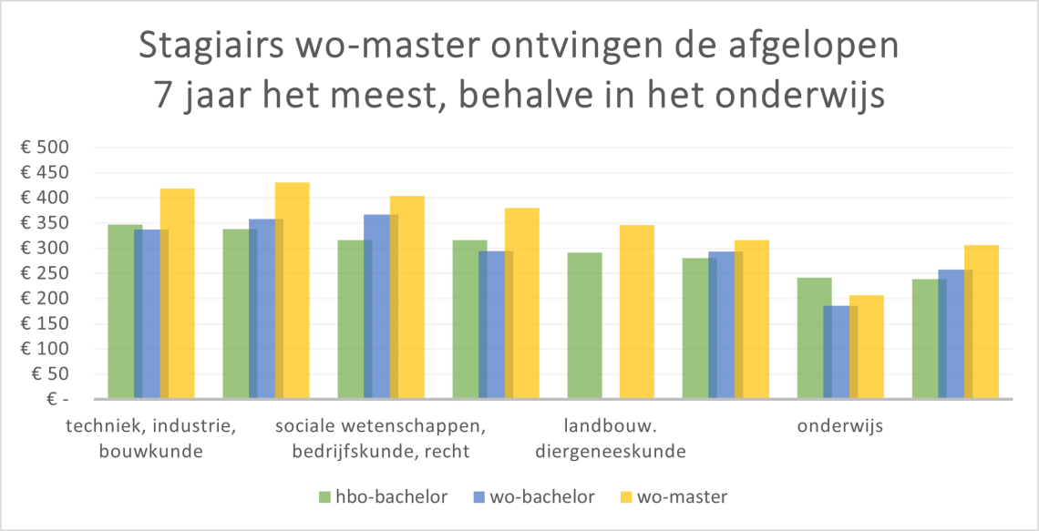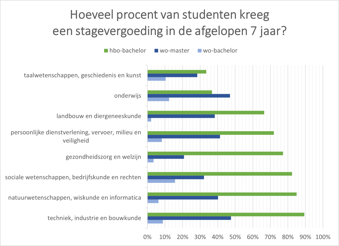 Studenten aan de universiteit lopen minder vaak stage dan hbo’ers of mbo’ers. Ze krijgen dan ook minder vaak een stagevergoeding tijdens hun studie. Slechts twaalf procent van de wo-bachelorstudenten en ruim dertig procent van de masterstudenten krijgt er een. Dat aandeel is al jaren stabiel.
