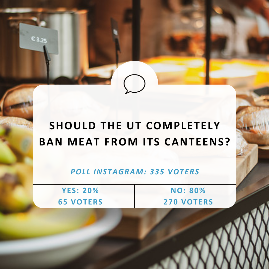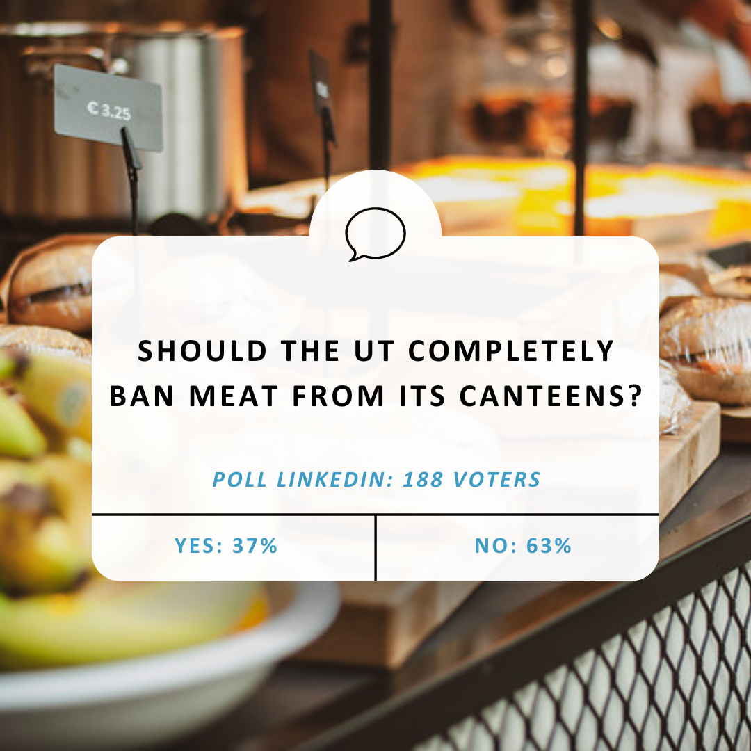 The fact that the enthusiasm for more plant-based products still has to grow among canteen visitors was shown by a poll that U-Today recently held among its followers on Instagram and LinkedIn. There the question was asked: 'Should the UT ban meat from its canteens?' Although the result is not representative of the UT population, 80 percent of the 276 Instagram voters indicate that they do not support this idea. On LinkedIn, the majority of people (60 percent of the 188 voters) do not want to completely ban meat from the canteens.