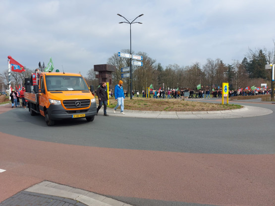 'Follow the music, follow the car and follow the noise!' With those words from Kees Wesselink-Schram, one of the initiators behind the strike, the march to the center of Enschede was started. The podium is cleared and the flags are put away. A number of UT employees go back into the buildings, the rest follow the orange vehicle driving ahead of the troops.