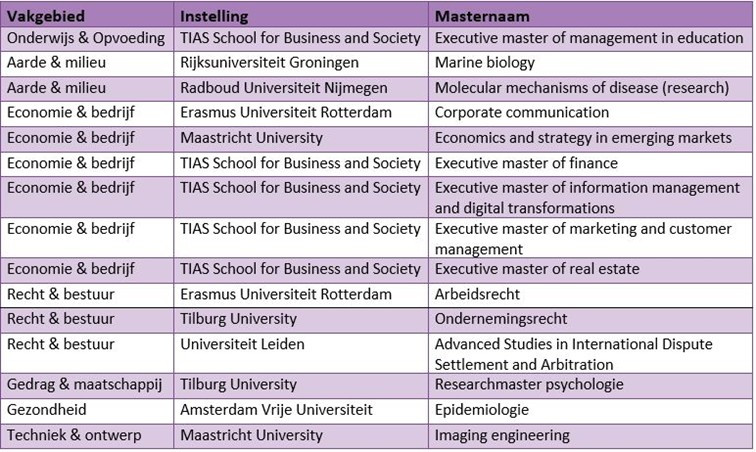 De publiek bekostigde universiteiten van Maastricht, Rotterdam en Tilburg hebben elk twee topmasters.