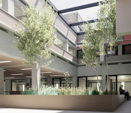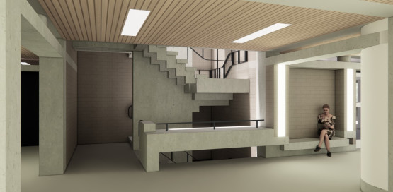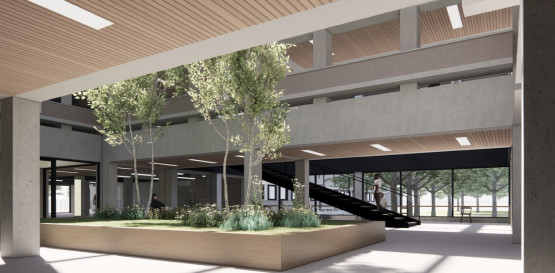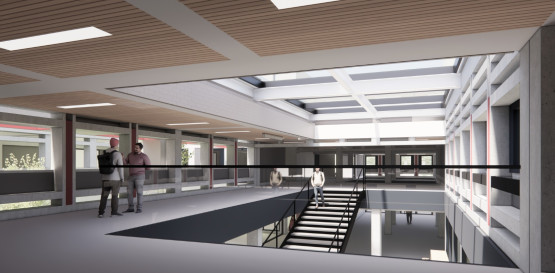 De centrale gangen dienen als het hart van het gebouw. ‘Die omgeving biedt straks werkplekken, collegezalen en studielokalen. In combinatie met het daglicht dat naar binnenvalt, komen er open en overzichtelijke ruimtes’, zegt Migchelbrink. Aan de buitenkant van het gebouw verandert er – op een paar kleine aanpassingen na – niets.