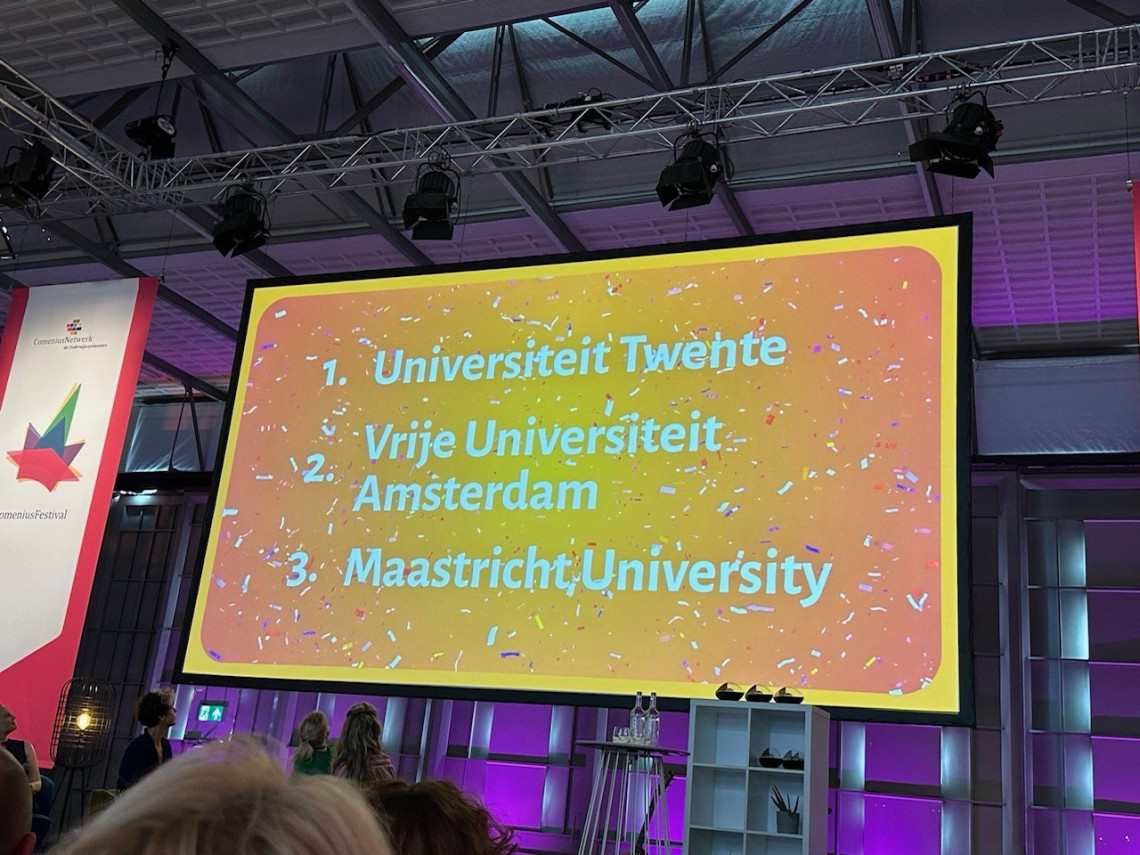 Dinsdagmiddag stond het bijna complete team van CLEAR op het podium in Den Haag. Het onderwijsinitiatief wist ronde na ronde te overleven en werd tot winnaar verkozen op het ComeniusFestival. ‘Vorig jaar overtuigden we het CvB om ons initiatief in te sturen voor deelname. Dat we nu winnaar zijn en ik de prijs namens het team in ontvangst mocht nemen, is supergaaf. Ik denk nog steeds aan het uitbundige applaus dat losbarstte toen wij als nummer een werden uitgeroepen. Mooi om mee te maken’, reageert Krab-Hüsken een dag later.