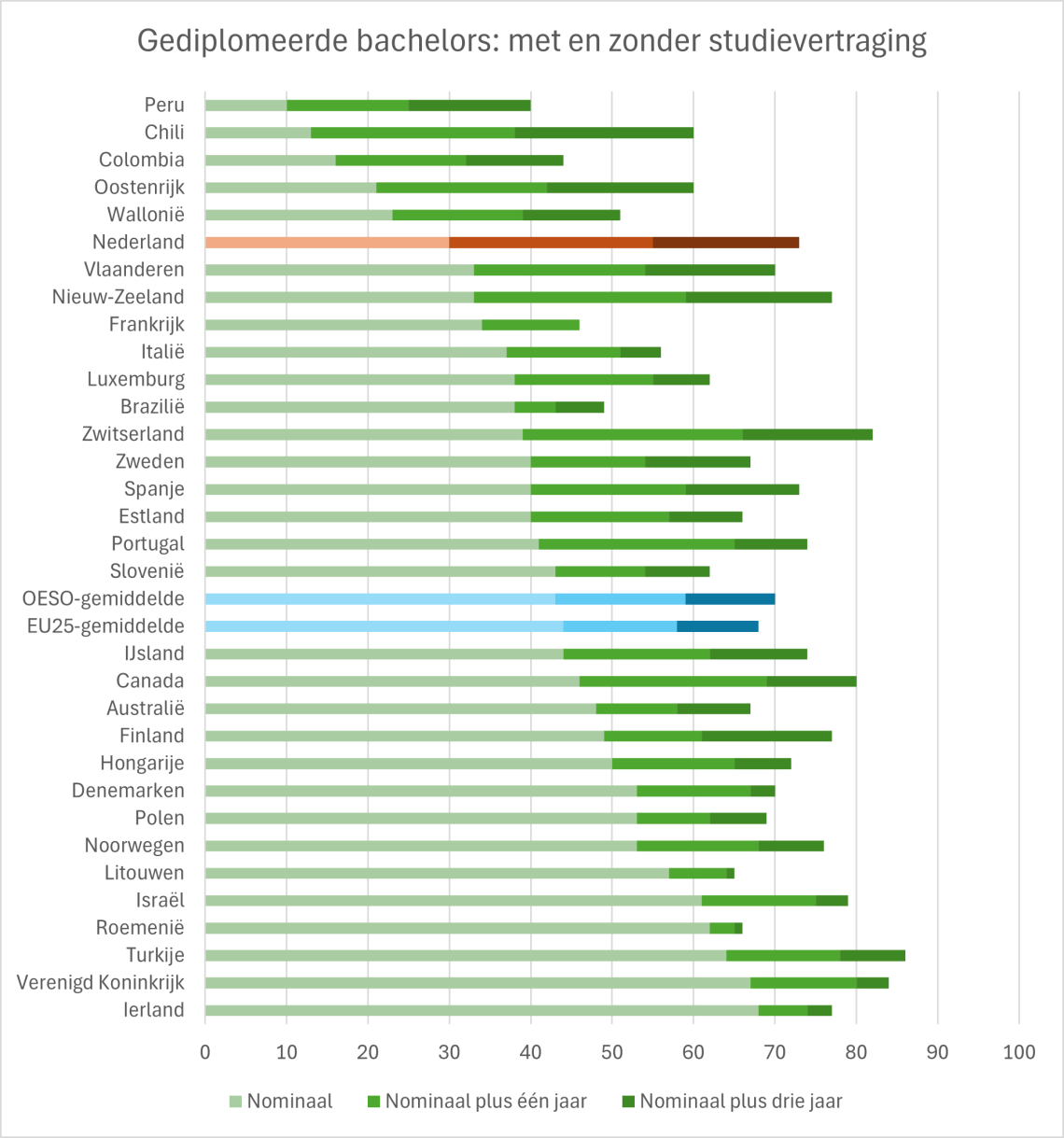Dat is in Nederland wel anders. Slechts 30 procent studeert nominaal af, 25 procent heeft tot één jaar langer nodig en 18 procent loopt nog meer vertraging op, staat in het rapport Education at a Glance 2025 van de OESO, een economische samenwerkingsorganisatie van 38 overwegend welvarende landen.