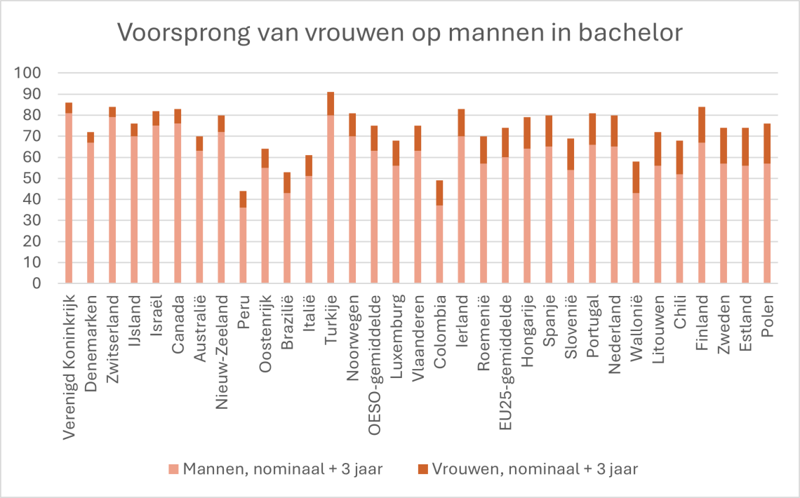 Vrouwen doen het wereldwijd beter in het onderwijs dan mannen, blijkt opnieuw uit het rapport, maar ook dat is niet overal hetzelfde. Het verschil tussen mannen en vrouwen is hier groter dan gemiddeld. Na zes jaar (wo) of zeven jaar (hbo) heeft 80 procent van de vrouwen minstens het bachelordiploma behaald, tegenover 65 procent van de mannen: het scheelt 15 procentpunt.