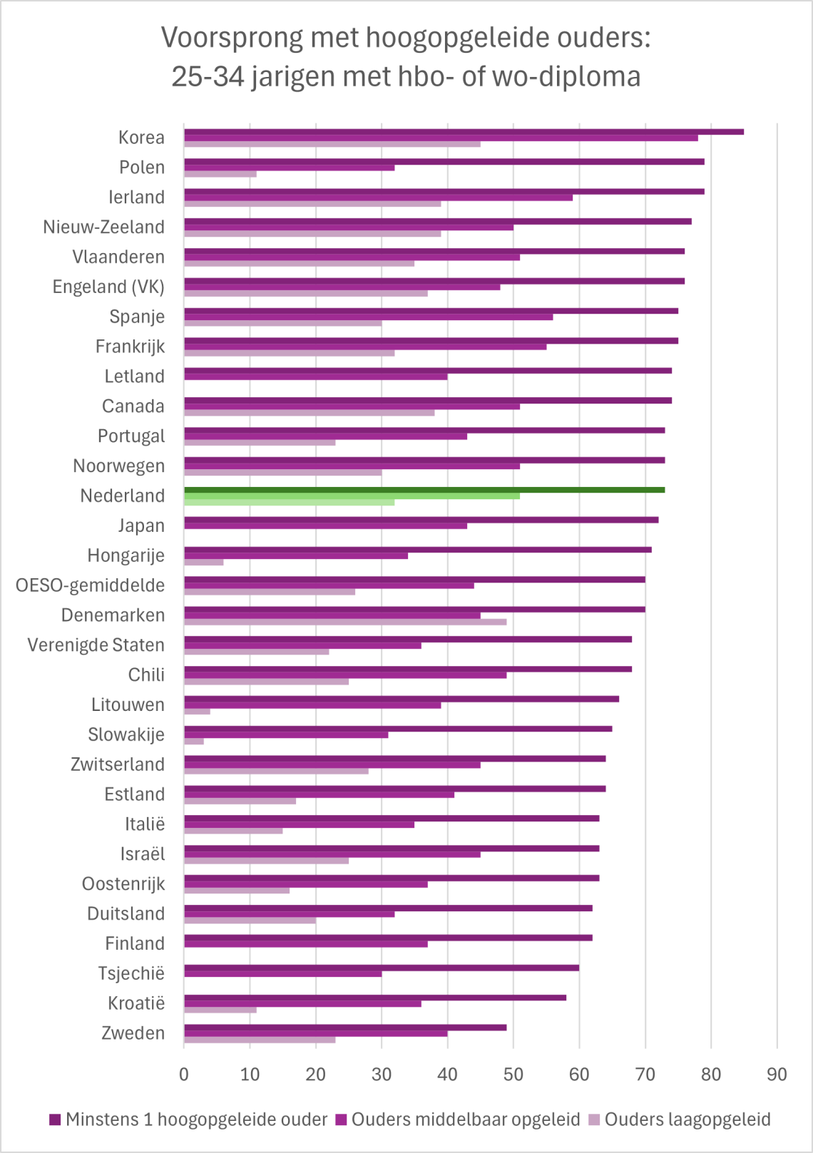 Waar je wieg staat, maakt in alle landen een verschil. De onderwijsdeskundigen van de OESO keken hoeveel jongeren zonder hoogopgeleide ouders een diploma behalen aan een hogeschool of universiteit, vergeleken met jongeren die wél minstens één hoogopgeleide ouder hebben. In Nederland gaapt er een verschil van 22 procentpunt tussen die twee groepen (en zelfs 41 procentpunt als beide ouders laagopgeleid zijn), wat iets kleiner is dan gemiddeld in de OESO-landen.