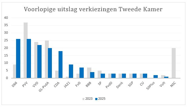 In de voorlopige verkiezingsuitslag is D66 even groot als de PVV: beide partijen staan op 26 zetels. Het kan haast niet anders of D66 gaat regeren. De PVV belandt dan in de oppositiebankjes.