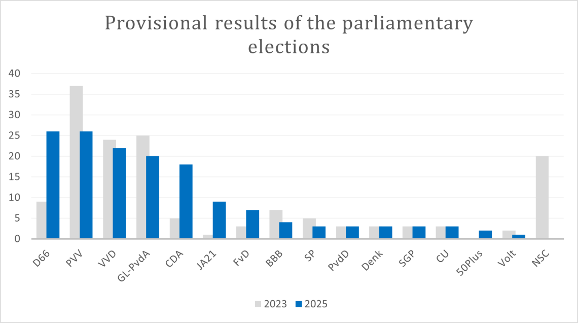 D66 matches PVV in the provisional election results, with both parties having 26 seats. It’s hard to imagine D66 not being part of the next government. In that case, PVV would end up in opposition.