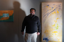 ‘Het is een ruimte vol abstracte schilderkunst rond het thema CROSSHAIR. Je ziet er ook een videovoorstelling. Er hangen nu veertien schilderijen van mij, maar daar komen er de komende weken steeds een paar bij. Er is dus geen vast beginpunt en ook geen eindpunt, omdat ikzelf ook in ontwikkeling blijf. Ik heb net mijn studie management, society and technology afgerond en begin deze week aan een master international business administration, dus voor mijzelf verschuift de focus ook. Ik krijg veel nieuwe indrukken. Het is dus een afspiegeling van mijn innerlijk over een langere tijd.’