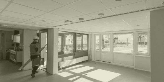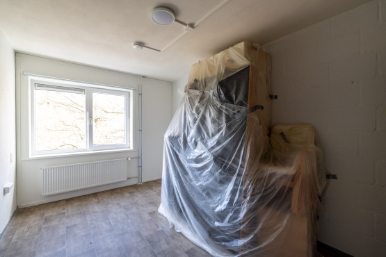 De laatste loodjes binnen, in Campuslaan 63. Een dag later verhuisden de bewoners terug. Ze mochten overigens zelf de kleuren aan de muur in de gemeenschappelijke ruimte kiezen. In hun geval lila, de buren van Campuslaan 65 kozen voor RAL9010-wit.