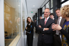 Minister Henk Kamp van Economische Zaken is vandaag, maandag 25 februari, op werkbezoek bij de Universiteit Twente. Vanmorgen sprak hij onder andere met Kees Eijkel, directeur Kennispark, en Dave Blank, wetenschappelijke directeur Mesa+, over innovatie in Twente en het topsectorenbeleid. High Tech Systemen en Materialen is een van de topsectoren en sterk vertegenwoordigd in de regio Twente.