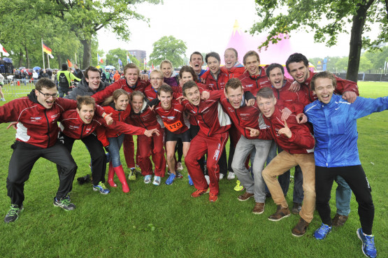 ‘Groningen is back!’, juichen ploegleiders Tim Stoffelsma en Frank Aanstoot als hun slotloper als eerste van de heren over de finish komt. En hoe. Jarenlang was het universiteitsteam van Groningen onverslaanbaar. Ze wonnen in 2007, 2008 en 2009. En in 2011 opnieuw. Tot ze twee jaar geleden, wegens miscommunicatie met de organisatie, niet mee konden doen aan de prestigieuze competitie van de batavierenrace. ‘Vorig jaar hebben we daarom een nieuwe start gemaakt, met een compleet nieuw team. We eindigden als vierde, maar wisten al wel dat er meer in zat en dat een podiumplek dit jaar tot de mogelijkheid behoorde.’, vertelt Stoffelsma.