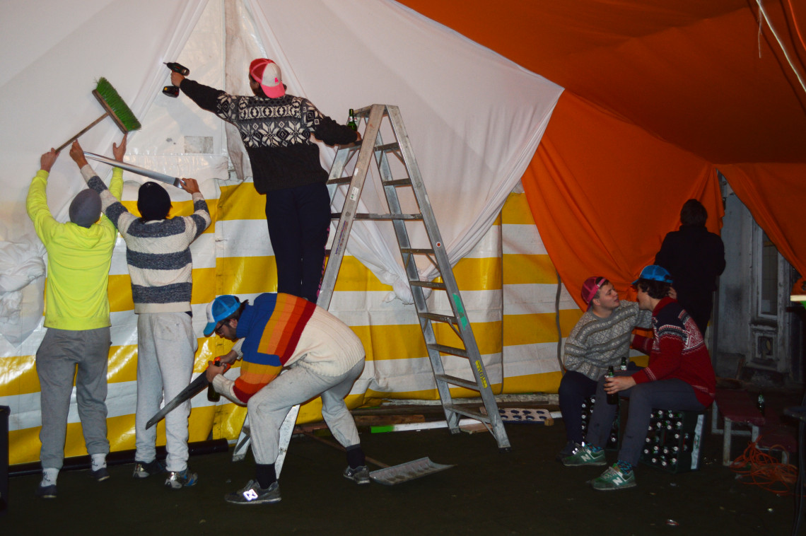 Sander: ‘We maken groepjes van twee en iedereen krijgt elke ochtend een taak door de nestor toegewezen. Er moet tapijt worden gelegd, de bars worden geplaatst, lichten worden opgehangen. We hebben ook een ‘team barring sea’, verantwoordelijk voor de afwatering mocht er veel regen komen. Tijdens de klusweek proberen we er zoveel mogelijk te zijn, maar er is wel ruimte om te studeren.’
