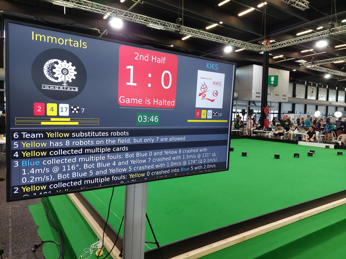 Het wordt nog wat ingewikkelder: de robot moet binnen een bepaalde tijd die bal ophalen. Er is namelijk bij elke wedstrijd een robot-variant van Danny Makkelie aanwezig. In dit geval gaat het om een puur softwarematige scheidsrechter, die het spel in goede banen moet leiden – wel geassisteerd door twee menselijke scheidsrechters. Maar robot-Makkelie registreert bijvoorbeeld of de robots genoeg afstand nemen bij een dood spelmoment en houdt toezicht of er geen sprake is van een double touch (eerst dribbelen, dan schieten). En ja, als de bal uitgaat, houdt de scheids in de gaten of de bal op de goede plek én of dat op tijd gebeurt. Lukt die ball placement niet, dan volgt een gele kaart.